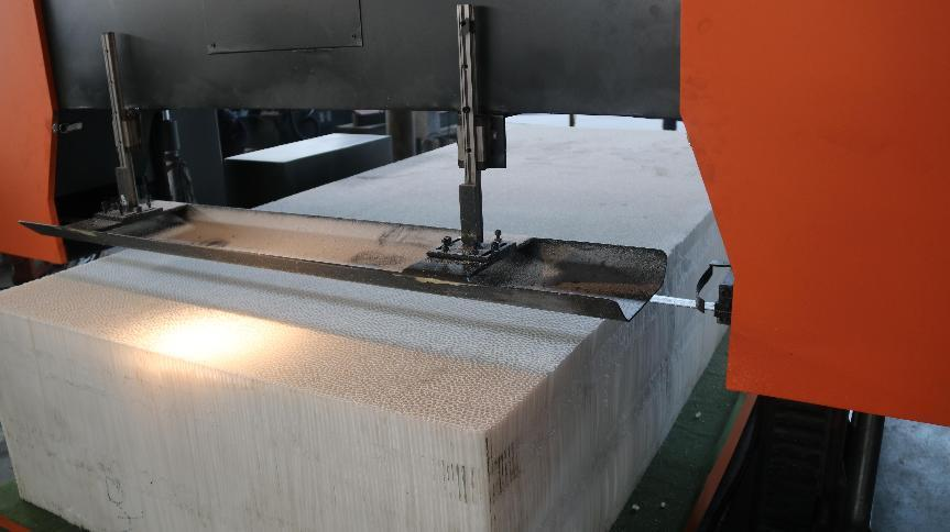 泡沫鋁是超輕純金屬材料,主要在于打造鋸床合適的鋸切范圍、靈活的工作臺、合理的固定裝置以及為客戶設(shè)計正確的鋸床切割參數(shù),使帶鋸床達到穩(wěn)定的鋸切效果,保障不對材料切割表面造成損耗。客戶所需切割的發(fā)泡鋁面積大,而對承重要求不高,因此適合使用具有高承載面積的數(shù)控臥式結(jié)構(gòu)帶鋸床。